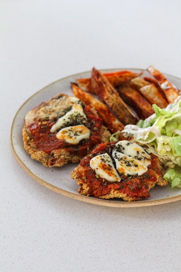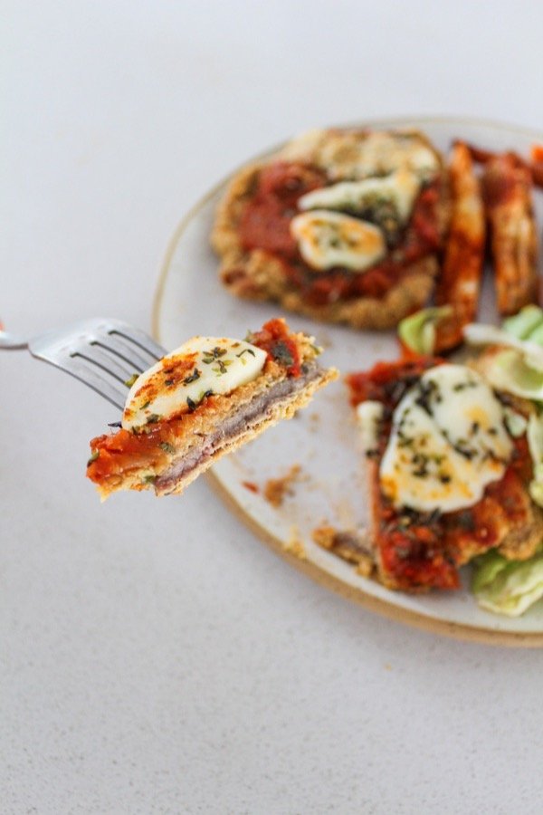 Milanesas: peceto, lino dorado, semillas, ajo, perejil, sal y huevo. Napolitana de mozzarella y tomate