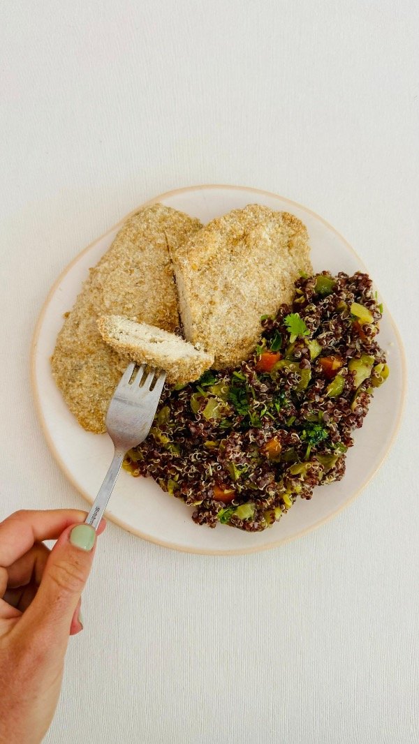 Pollo, lino molido dorado, semillas, huevo, ajo, perejil y sal