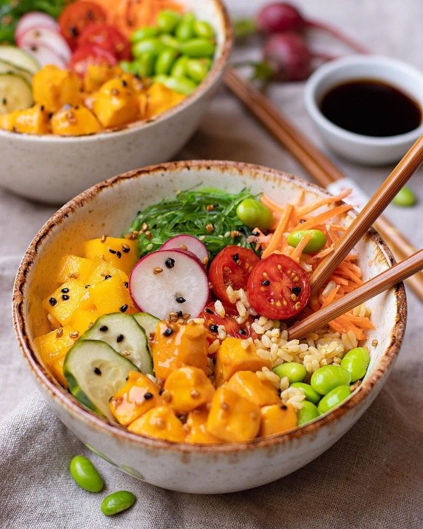 Arroz integral, pollo agridulce, rabanito, mango, pepino, zanahoria, cherrys, sal, pimienta, semillas, maní